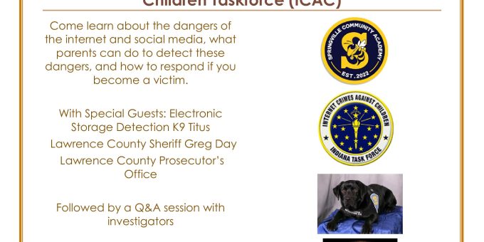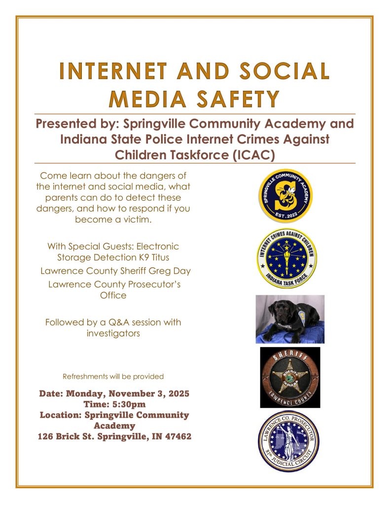 SPRINGVILLE — Springville Community Academy (SCA), in collaboration with the Indiana State Police Internet Crimes Against Children Taskforce (ICAC), is hosting a crucial community presentation on Internet and Social Media Safety for all of Lawrence County and surrounding areas on Monday, November 3, at 5:30 p.m. at the Springville Community Academy, at 126 Brick Street, in Springville.