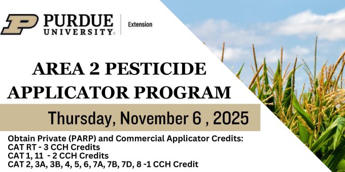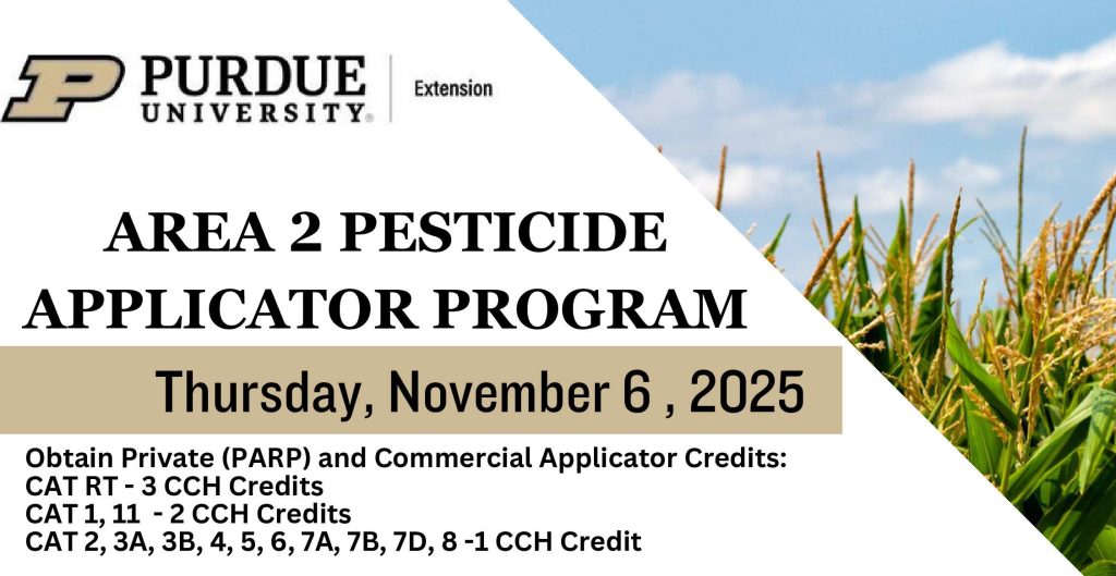 SOUTH-CENTRAL INDIANA—Purdue Extension is hosting the Area 2 Pesticide Applicator Program on Thursday, November 6, 2025, providing an opportunity for private and commercial applicators to obtain required recertification credits. The program is being offered at three different locations and times across Crawford, Washington, and Scott Counties to accommodate local applicators.