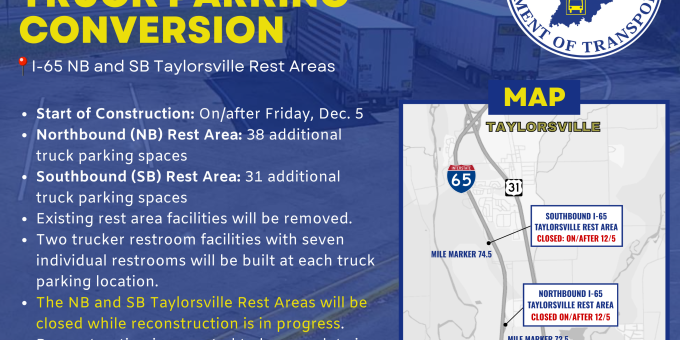 The project is anticipated to be complete in late 2027, weather permitting. Both the northbound and southbound rest areas will remain closed throughout the project’s duration. Traffic impacts are not expected on the mainline I-65 during construction.