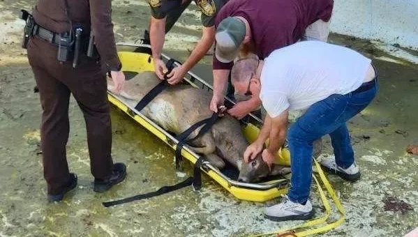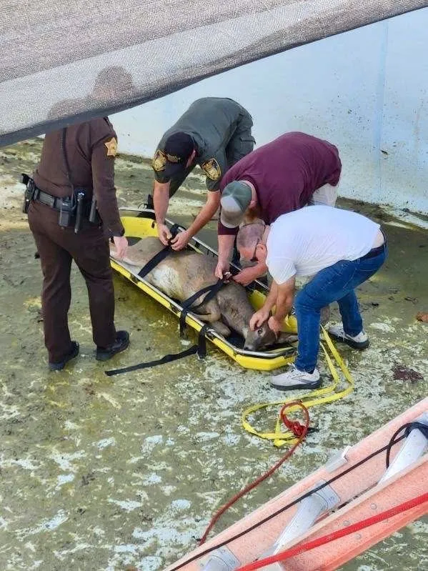 After the deer was sedated, rescue teams carefully placed the animal on a backboard for medical transport. Utilizing the equipment and manpower from multiple agencies, the deer was successfully hoisted out of the deep pool.