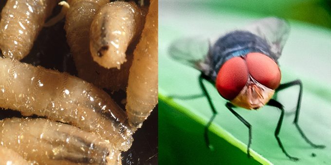 Adult screwworm flies are about the size of a common housefly. They have orange eyes, a metallic blue or green body, and three dark stripes along their backs.