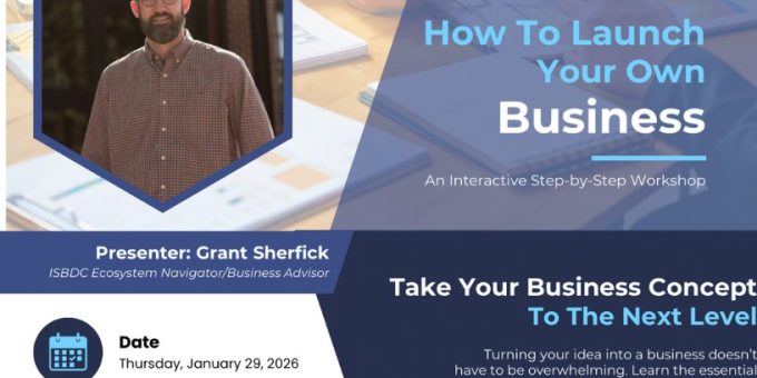 The session will be led by Grant Sherfick, an ISBDC ecosystem navigator and business advisor, who will walk participants through the essential steps of launching a business. Topics will include evaluating business ideas, understanding startup basics, building a solid plan, and gaining confidence to move from concept to launch. The workshop is designed to support both first-time entrepreneurs and those refining an existing idea.