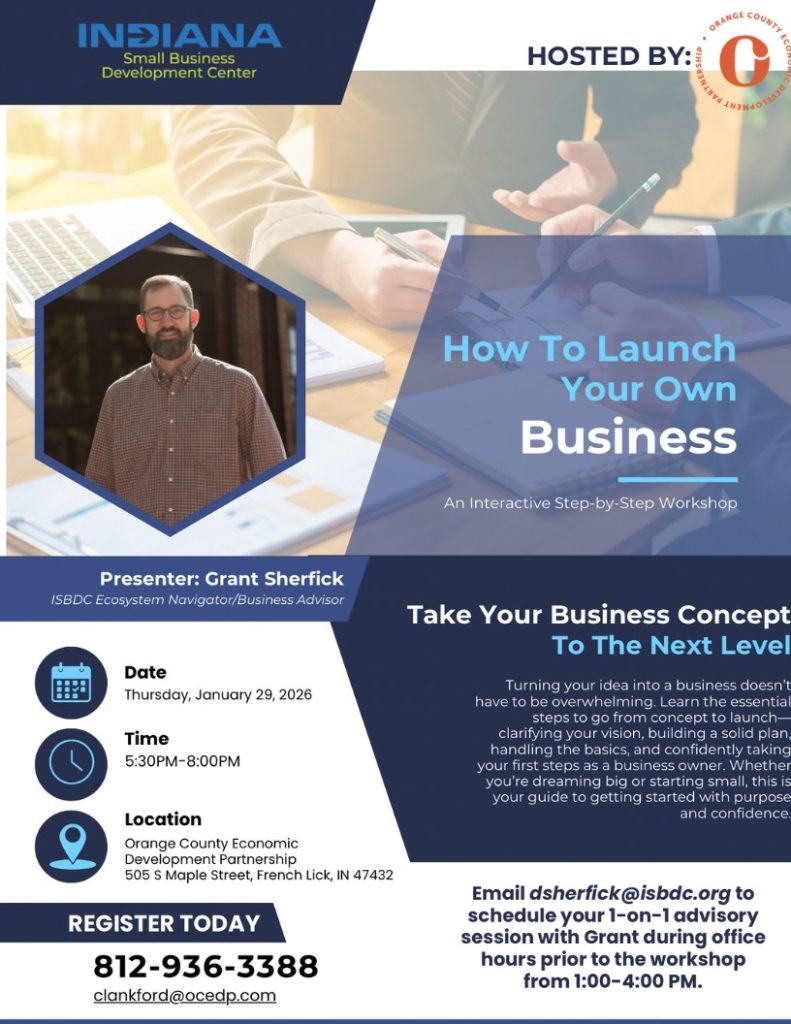 The interactive workshop, titled How to Launch Your Own Business, will be held on Thursday, Jan. 29, 2026, from 5:30 to 8 p.m. at the Orange County Economic Development Partnership office, located at 505 S. Maple Street in French Lick.
