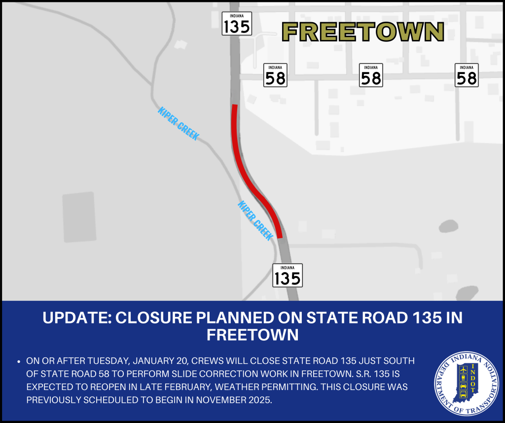 FREETOWN – Indiana Department of Transportation contractor Geostabilization International (GSI) is scheduled to close State Road 135 just south of State Road 58 on or after Tuesday, January 20, to perform slide correction work in Freetown.