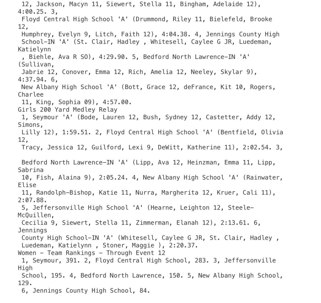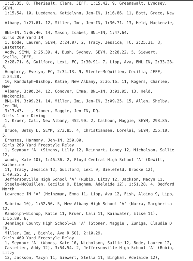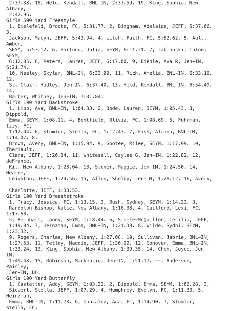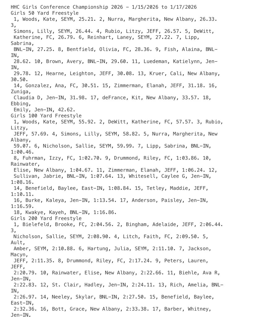 COLUMBUS – Bedford North Lawrence’s Ava Lipp won her signature event, taking the title in the 100-yard backstroke in the Hoosier Hills Conference meet during girls high school swimming action on Saturday.