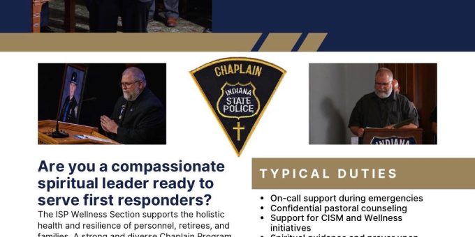INDIANA – The Indiana State Police is seeking clergy members interested in serving as volunteer chaplains through its ISP Chaplain Program.