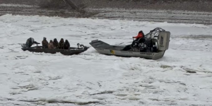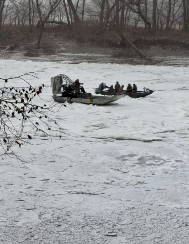 Under weather conditions of 12 degrees and snow, with that area of the river nearly frozen from bank to bank, officers deployed an airboat, reached the hunters, and brought them safely to shore.