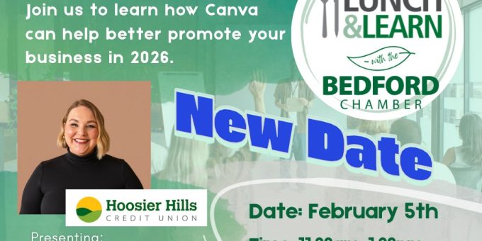 The Lunch & Learn will take place on Thursday, February 5, from 11:30 a.m. to 1:00 p.m. in the Bedford Chamber Meeting Room. The session will be led by Ashlynne Bender, Community Relations Coordinator at Hoosier Hills Credit Union, who will walk participants through practical ways Canva can be used to strengthen branding and streamline business promotion in 2026.