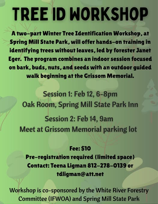 The workshop is co-sponsored by the White River Forestry Committee and Spring Mill State Park. For more information or to register, contact Teena Ligman at 812-278-0139 or by email at tdlilman@att.net.