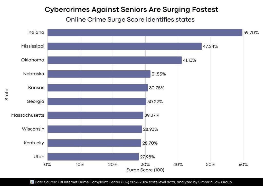 INDIANA — An alarming new study has revealed that Indiana leads the nation in the acceleration of cybercrime targeting seniors. According to data analyzed by Simmrin Law Group, Indiana experienced a staggering 324.8% increase in senior cybercrime complaints between 2023 and 2024—the highest spike of any U.S. state.