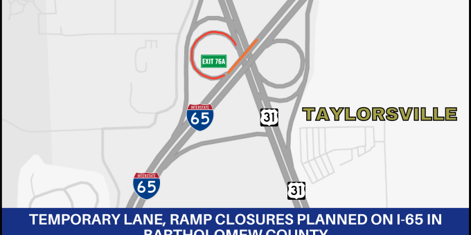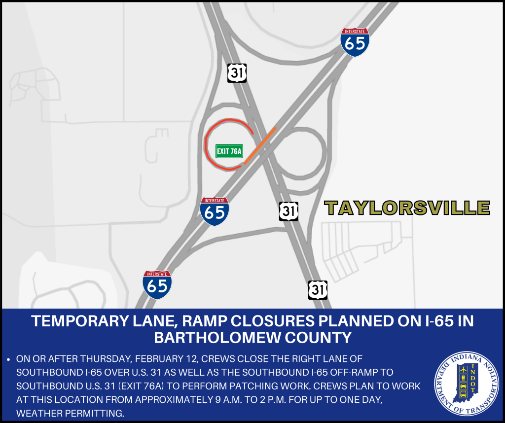 BARTHOLOMEW COUNTY – The Indiana Department of Transportation announces upcoming temporary lane and ramp closures on I-65 on or after Thursday, February 12, for patching work near Taylorsville.