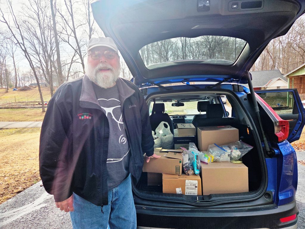 Lion Jim Fisher, with recycled eyeglasses and hearing aids collected from boxes at various locations around our county, loaded into the back of Lion Jan Allen’s car, headed to a Lions district meeting. These eyeglasses and hearing aids will be going to the Indiana Lions State Office Building in Indianapolis for recycling distribution to people in need.