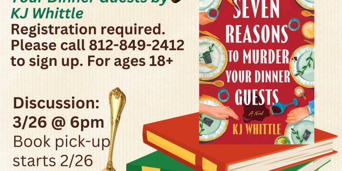 The group will discuss the cozy mystery novel “7 Reasons to Murder Your Dinner Guests” by KJ Whittle. The program is open to adults ages 18 and older, and registration is required.