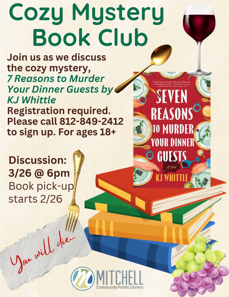 MITCHELL — Mitchell Community Public Library will host a Cozy Mystery Book Club discussion on Thursday, March 26, at 6 p.m.