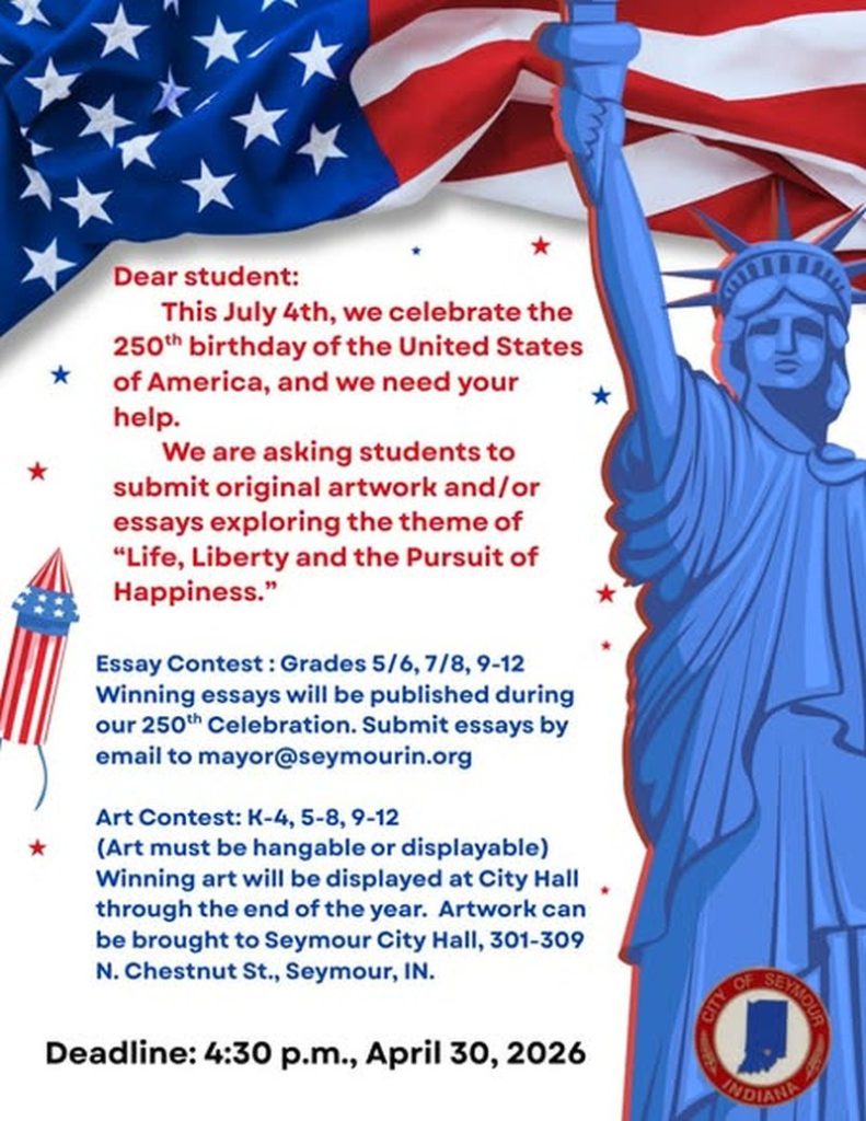 SEYMOUR — As the United States approaches the historic 250th anniversary of the signing of the Declaration of Independence, the City of Seymour is calling on its youngest citizens to lead the celebration. Mayor Matt Nicholson’s office has officially opened a city-wide art and essay contest, inviting students to reflect on the nation’s founding principles.