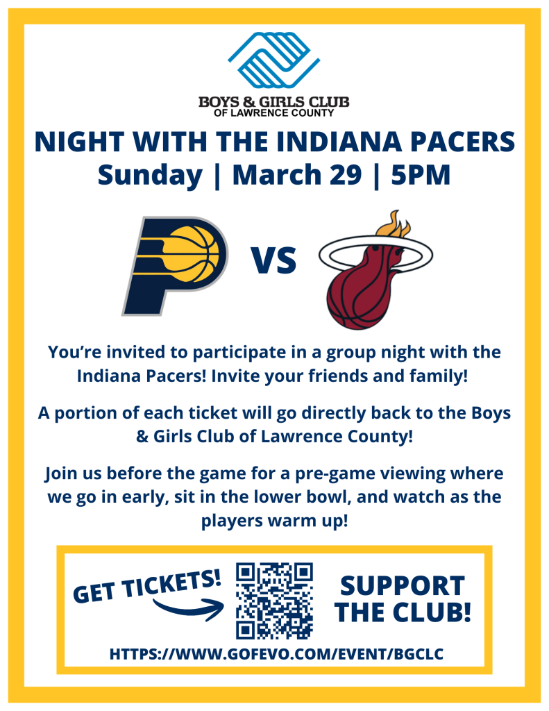 BEDFORD – Today is the final day to purchase tickets for the Boys & Girls Club of Lawrence County’s group night with the Indiana Pacers, scheduled for Sunday, March 29.