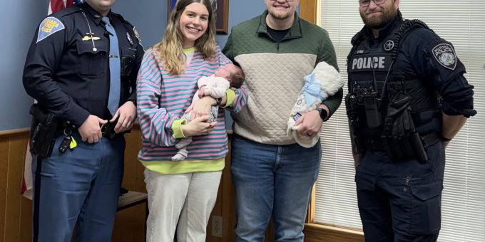 KOSCIUSKO CO. – Valentine’s Day 2026 will be remembered by a Milford couple and Indiana State Trooper Ausitn Slone and Milford Police Department Deputy Marshall Dallas Rice for being the year of a special “delivery.”