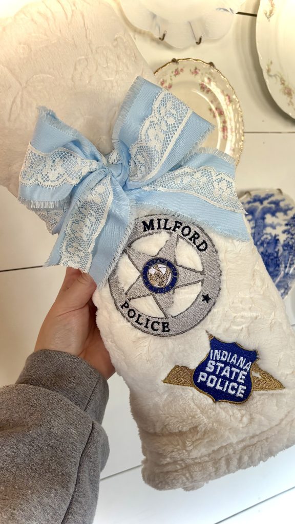 Last week Slone and Rice met with the Wuthrich’s at the Milford Police Department to talk about the experience and to meet baby Ellie under less stressful circumstances.  They gave Ellie a custom-made blanket with each department logo on it.