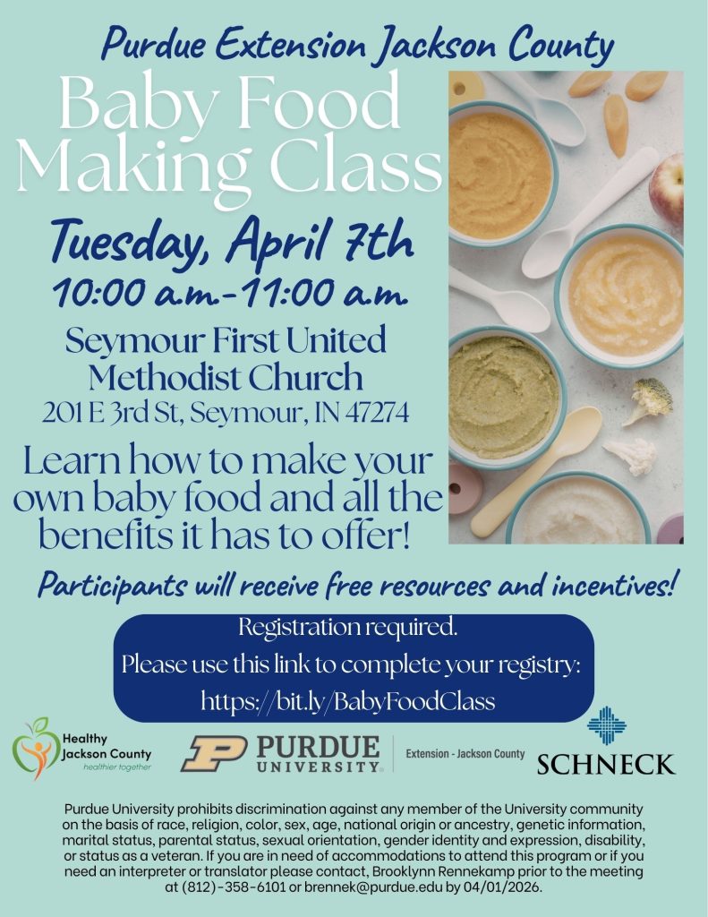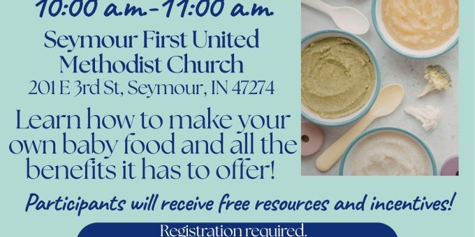 SEYMOUR — Purdue Extension Jackson County will offer a free Baby Food Making Class on Tuesday, April 7, from 10 to 11 a.m. at Seymour First United Methodist Church.