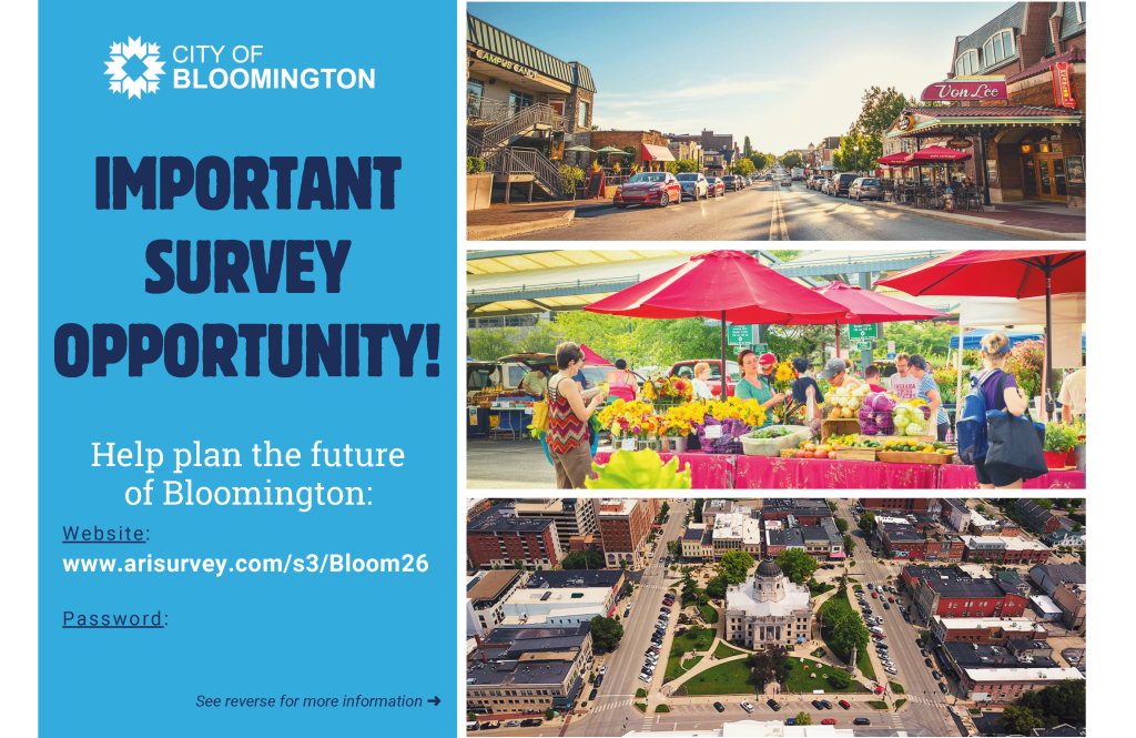 Past Community Survey results are available at bloomington.in.gov/communitysurvey. The full 2026 report will be released following completion of data collection and presented at a public meeting, with details forthcoming.