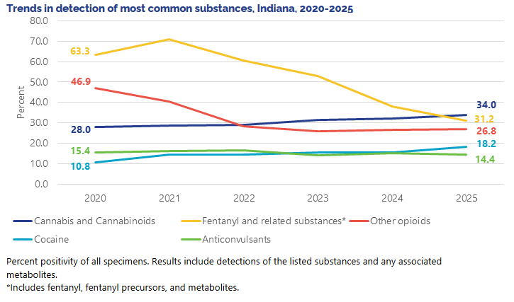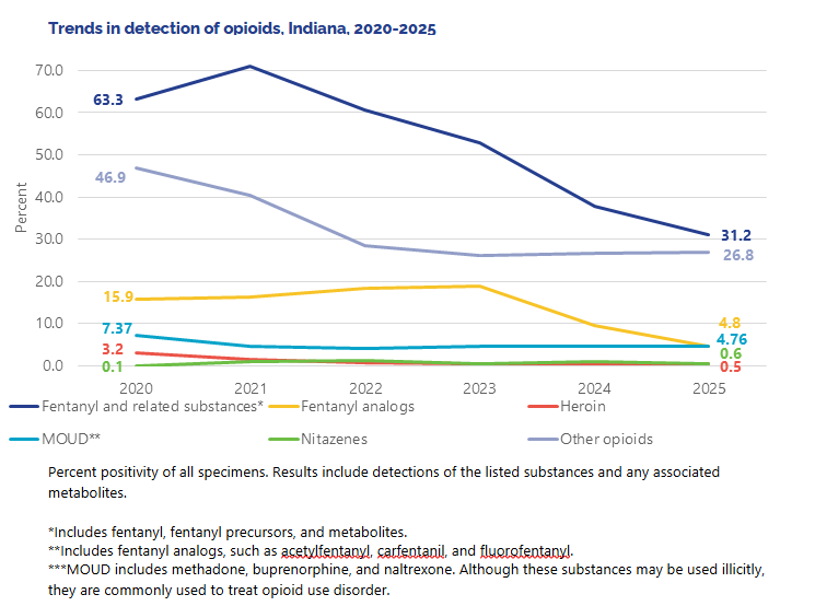 Indiana had 43 Carfentanil detections in toxicology data in 2025, a 72% increase from 2024, which had 25 detections