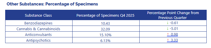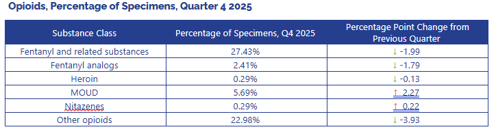 Notable decreases in quarter 4, compared to the previous quarter, include the fentanyl & fentanyl analogs, other opioids, and cannabis & cannabinoids categories.