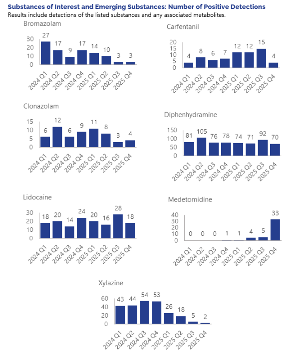 Medetomidine counts continue to increase, while xylazine counts continue to decrease. Indiana saw 43 detections of medetomidine in toxicology data in 2025, up from only 1 detection in 2024. Most of these detections (33) occurred in quarter 4 of 2025.