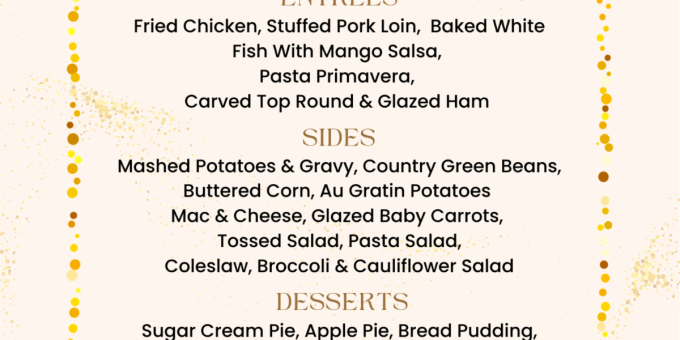 Dessert options will include sugar cream pie, apple pie, bread pudding, pineapple soufflé, granny white cake, and blackberry and apple cobbler. Soda and coffee are included in the price, though taxes and service charges are not. The cost is $36.99 for adults and $18.49 for children ages 4 to 10, while children ages 3 and under may eat for free.