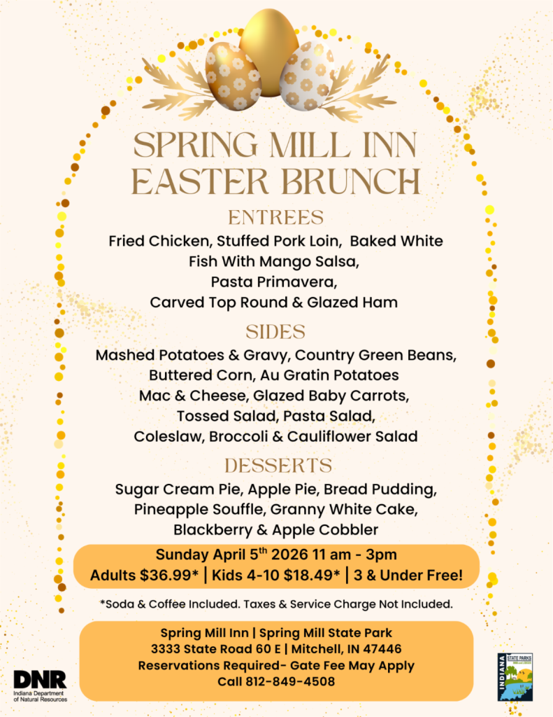 MITCHELL – Spring Mill Inn at Spring Mill State Park will host its annual Easter brunch on Sunday, April 5, 2026, from 11 a.m. to 3 p.m. The menu features entrees such as fried chicken, stuffed pork loin, baked white fish with mango salsa, pasta primavera, and carved top round and glazed ham. Sides include mashed potatoes and gravy, country green beans, buttered corn, au gratin potatoes, mac and cheese, glazed baby carrots, tossed salad, pasta salad, coleslaw, and broccoli and cauliflower salad.