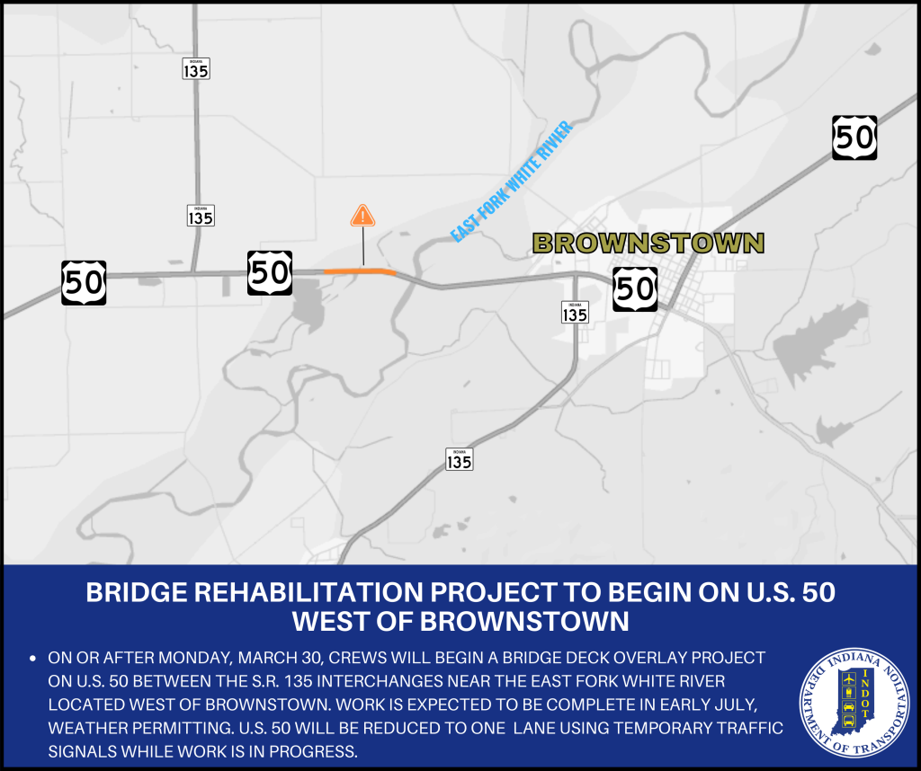 JACKSON COUNTY — Indiana Department of Transportation contractor E&B Paving, Inc., is scheduled to begin a bridge deck overlay project on U.S. 50 near the East Fork White River on or after Monday, March 30, just west of Brownstown.