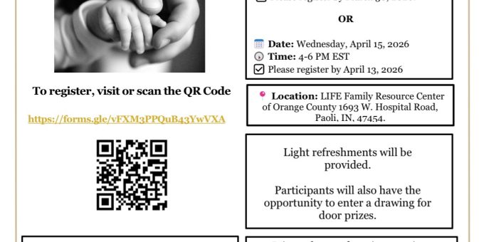 Both events will take place at the LIFE Family Resource Center of Orange County, located at 1693 W. Hospital Road in Paoli. Light refreshments will be provided, and attendees will have the opportunity to enter a drawing for door prizes.