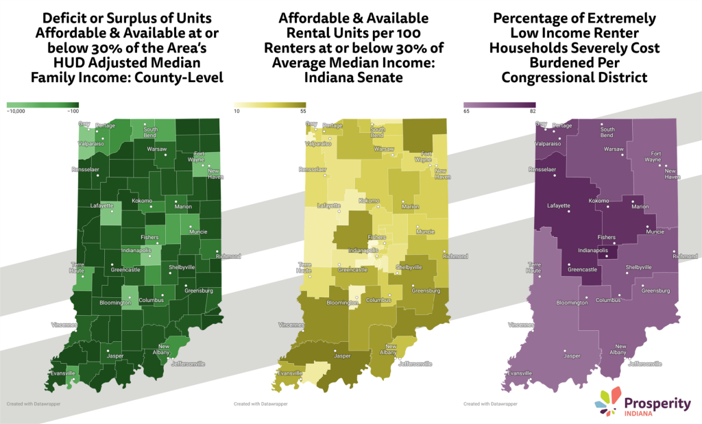 INDIANA – Every Indiana county, state legislative district, and Congressional district has a gap in affordable homes and a rate of severe housing cost burden that is concentrated at the lower end of the income spectrum, according to new data released by Prosperity Indiana and the National Low Income Housing Coalition.