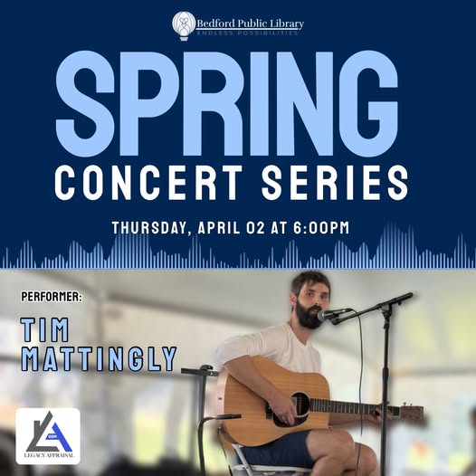 BEDFORD — The Bedford Public Library will continue its Spring Concert Series next week with a live performance by local musician Tim Mattingly. The event is scheduled for Thursday, April 2, 2026, at 6:00 p.m.