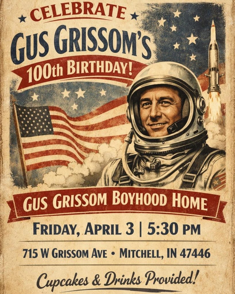 The event is scheduled for Friday, April 3, 2026, at 5:30 p.m. at the historic home located at 715 W. Grissom Ave. in Mitchell. Attendees can enjoy cupcakes and drinks as they gather to celebrate Grissom’s contributions to the American space program.