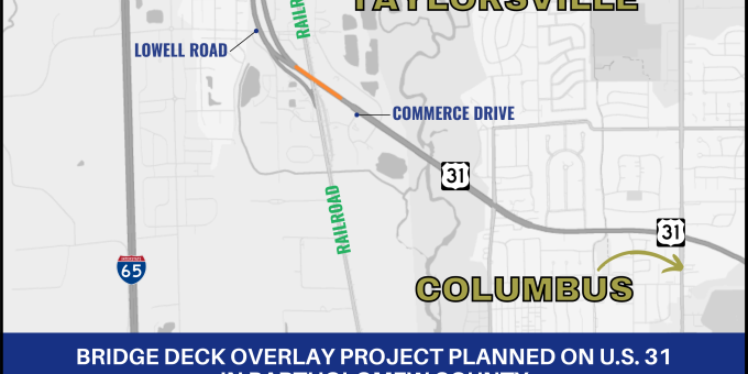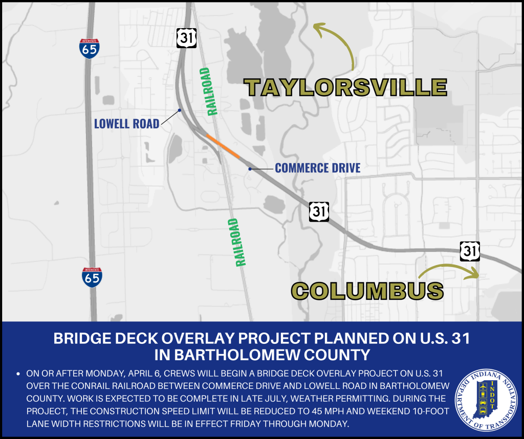 BARTHOLOMEW COUNTY — Indiana Department of Transportation contractor E&B Paving, Inc., is scheduled to begin a bridge deck overlay project on U.S. 31 between Taylorsville and Columbus on or after Monday, April 6.