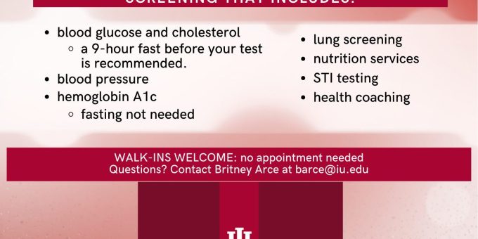 The available screenings include blood glucose and cholesterol tests, with a nine-hour fast recommended before testing. Other services provided are blood pressure checks, hemoglobin a1c testing where fasting is not required, lung screenings, and sti testing. Attendees can also access nutrition services, health coaching, and learn their health numbers.