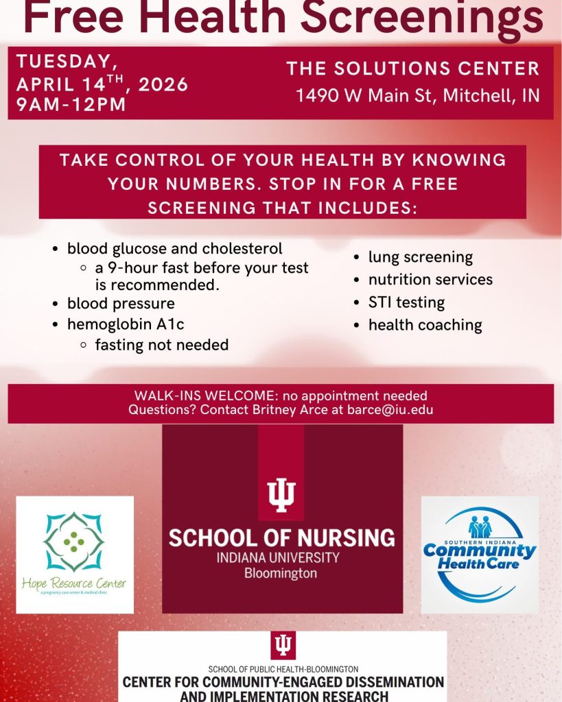 The event is supported by hope resource center, indiana university school of nursing bloomington, southern indiana community health care, and the center for community-engaged dissemination and implementation research. Questions regarding the screenings can be directed to Britney Arce at barce@iu.edu.