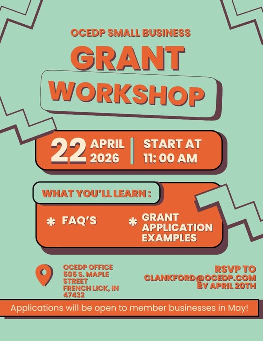 FRENCH LICK – The Orange County Economic Development Partnership will host a small business grant workshop on Wednesday, April 22. The session is scheduled to begin at 11:00 a.m. at the partnership office located at 505 S. Maple Street. The workshop is designed to assist those planning to apply for the 2026 small business grant by covering frequently asked questions and providing real application examples.