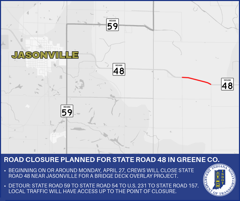 Beginning on or around Monday, April 27, crews will close State Road 48 near Jasonville. This closure will occur between County Road 800 W and County Road 900 W over Howesville Ditch.