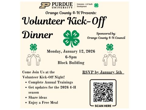 PAOLI — Orange County 4-H will kick off the 2026 season with a Volunteer Kick-Off Dinner on Monday, Jan. 12, inviting current and prospective volunteers…