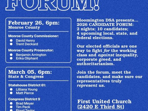 BLOOMINGTON — As the 2026 election cycle gains momentum, the Bloomington Democratic Socialists of America (DSA) has announced a comprehensive two-night Candidate Forum designed to…