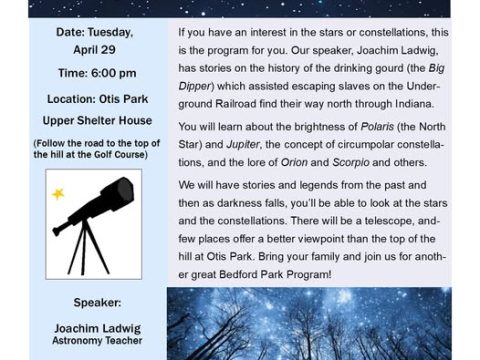 BEDFORD – The Bedford Parks Department will present a free program, “Stars and Stories at Otis Park,” on Tuesday, April 29, 2025, at 7:30 p.m….