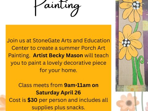 BEDFORD— The StoneGate Arts and Education Center invites the public to a unique art class focused on creating a decorative “Porch Art Painting.” Artist Becky…