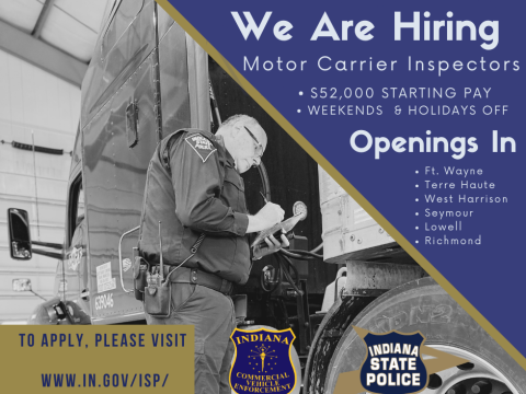 INDIANA—The Indiana State Police is accepting applications for Motor Carrier Inspectors (MCI). The MCI positions will staff permanent-scale facilities in Fort Wayne, Lowell, Richmond, Seymour,…