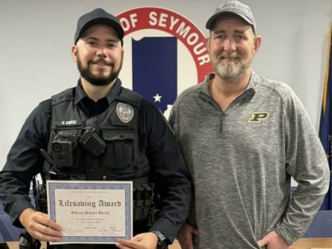 SEYMOUR— The Seymour Police Department recently honored one of its own, Officer Dakota Burke, for quick thinking and heroic action that saved a neighbor’s life…