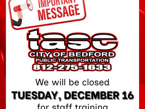 BEDFORD — The Transit Authority of Stone City (TASC) will suspend all bus services on Tuesday, December 16, to allow staff to participate in scheduled…