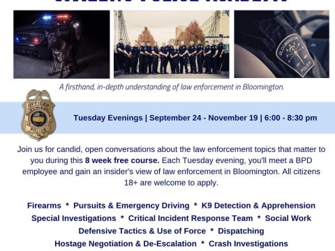 BLOOMINGTON – The Bloomington Police Department is now accepting applications for its annual Citizens Police Academy.  The Citizens Police Academy is an eight-week program…