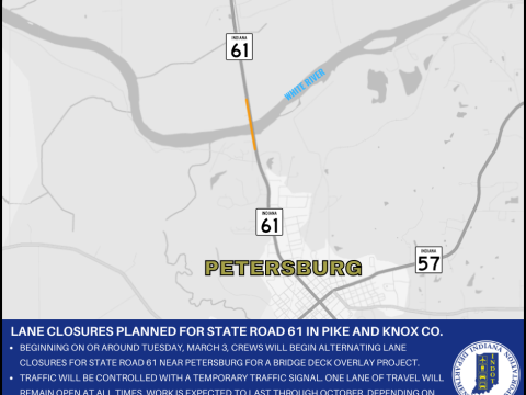 PIKE/KNOX CO. – The Indiana Department of Transportation announces a lane closure for State Road 61 in Pike and Knox Counties. Beginning on or around…
