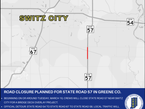 GREENE COUNTY – The Indiana Department of Transportation announces a road closure for State Road 57 in Greene County. Beginning on or around Tuesday, March…