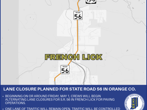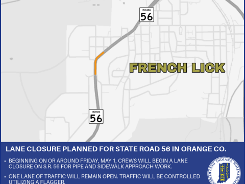 ORANGE COUNTY – The Indiana Department of Transportation announces a lane closure for State Road 56 in Orange County. Beginning on or around Friday, May…